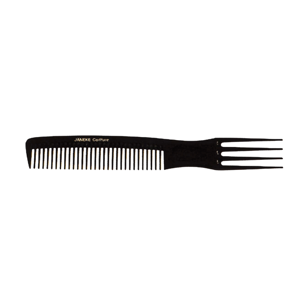 Peigne fourchette. Idéal pour les chevelures épaisses et les cheveux grossiers. Les dents sont espacées pour démêler facilement les longueurs sans accrocs, tandis que la fourchette est parfaite pour séparer les mèches et travailler le brushing.
