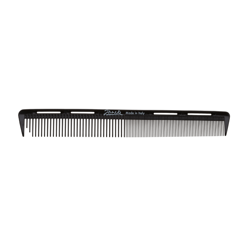 Pettine da taglio uomo e per capelli corti. La densità rada dei denti serve per le ciocche più corpose, mentre la più fitta per le rifiniture. La ridotta dimensione lo rende più maneggevole per le chiome meno dense e anche per le teste dei bambini.